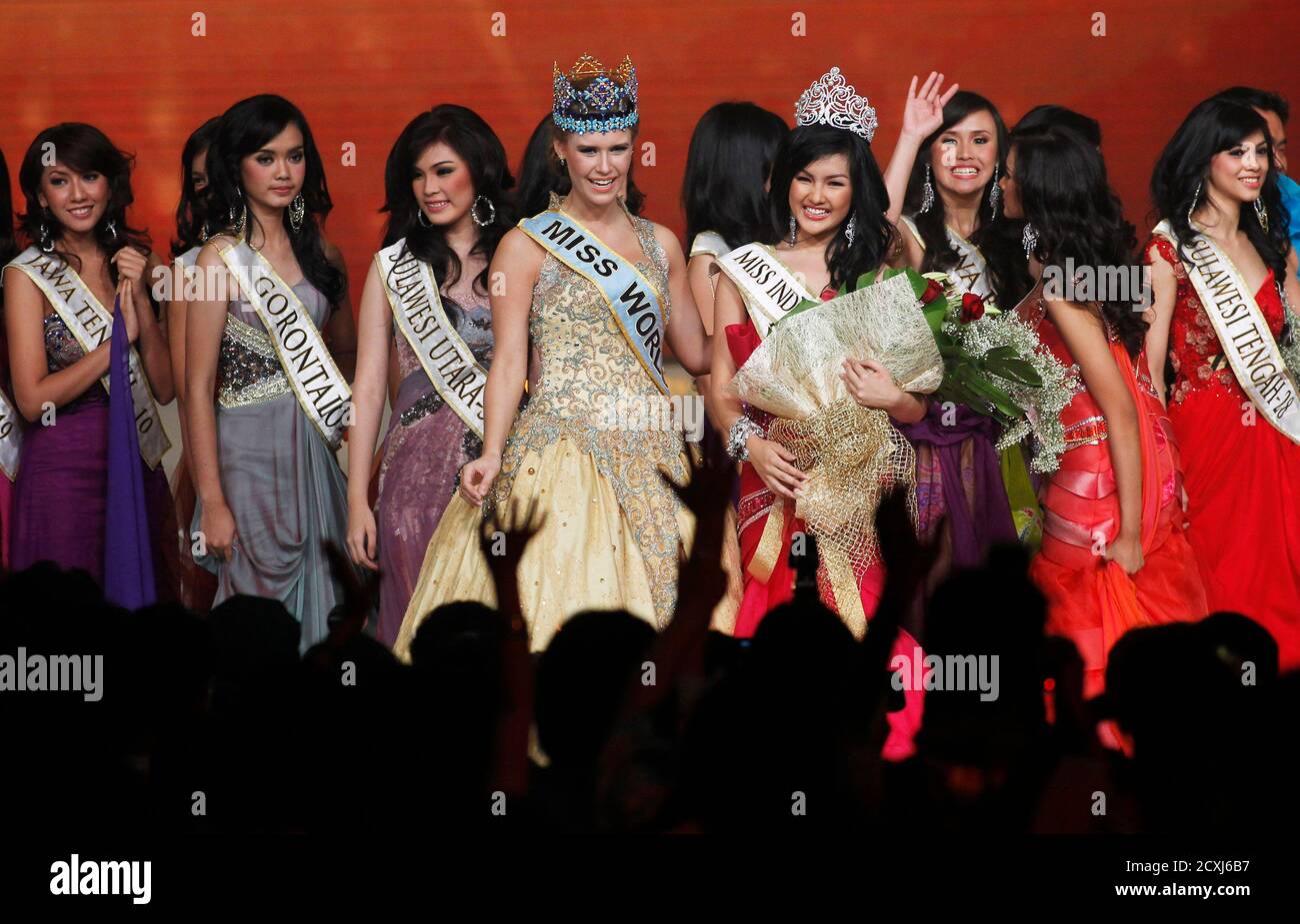 Winner Of Miss Indonesia 2011 Astrid Ellena Indriana Yunadi Center R Stands With Miss World 2010 Alexandria Mills Of The U S During The Pageant S Final In Jakarta June 4 2011 Thirty Three Contestants